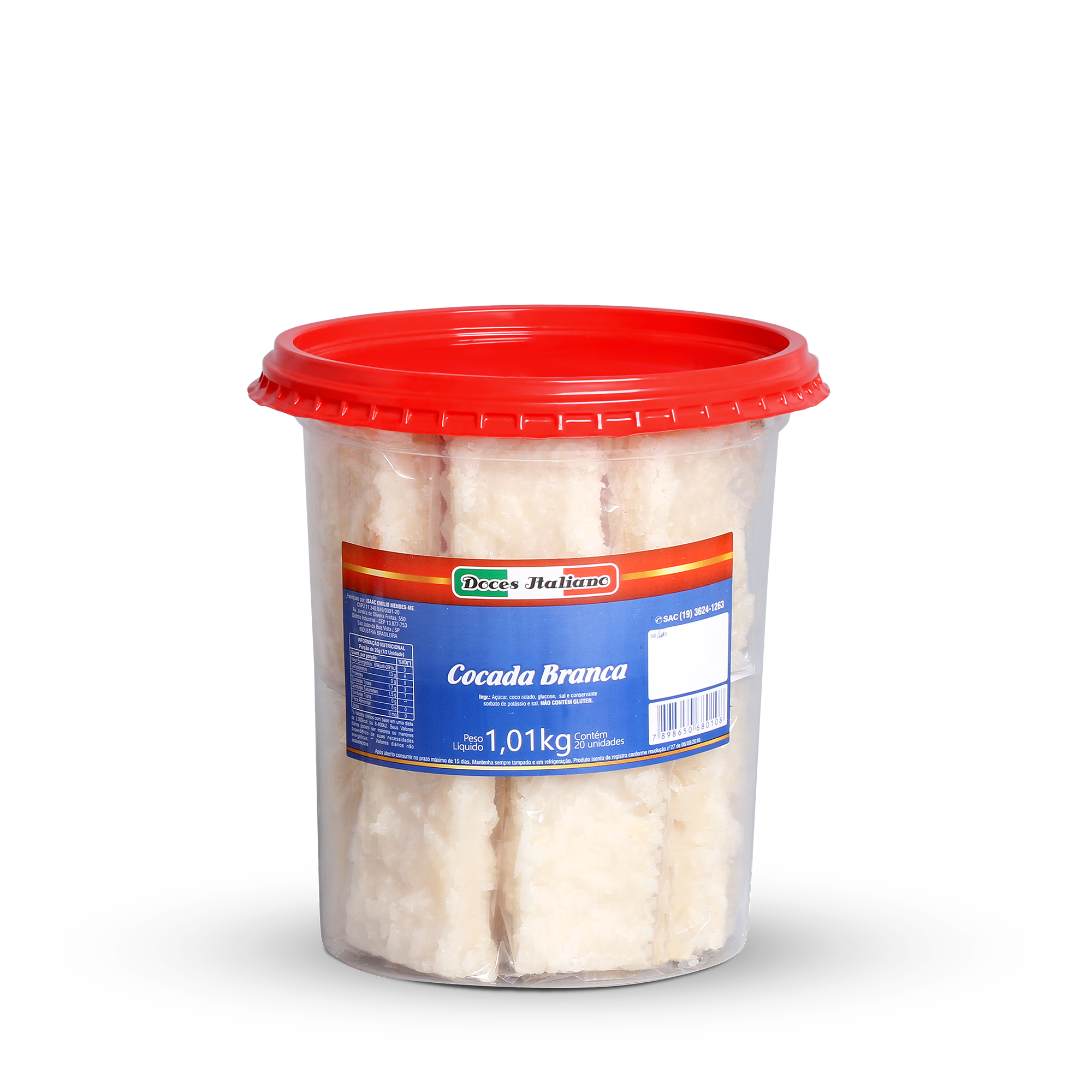Ingr: Açúcar, coco ralado, glucose, sal e coservante sorbato de potássio e sal.