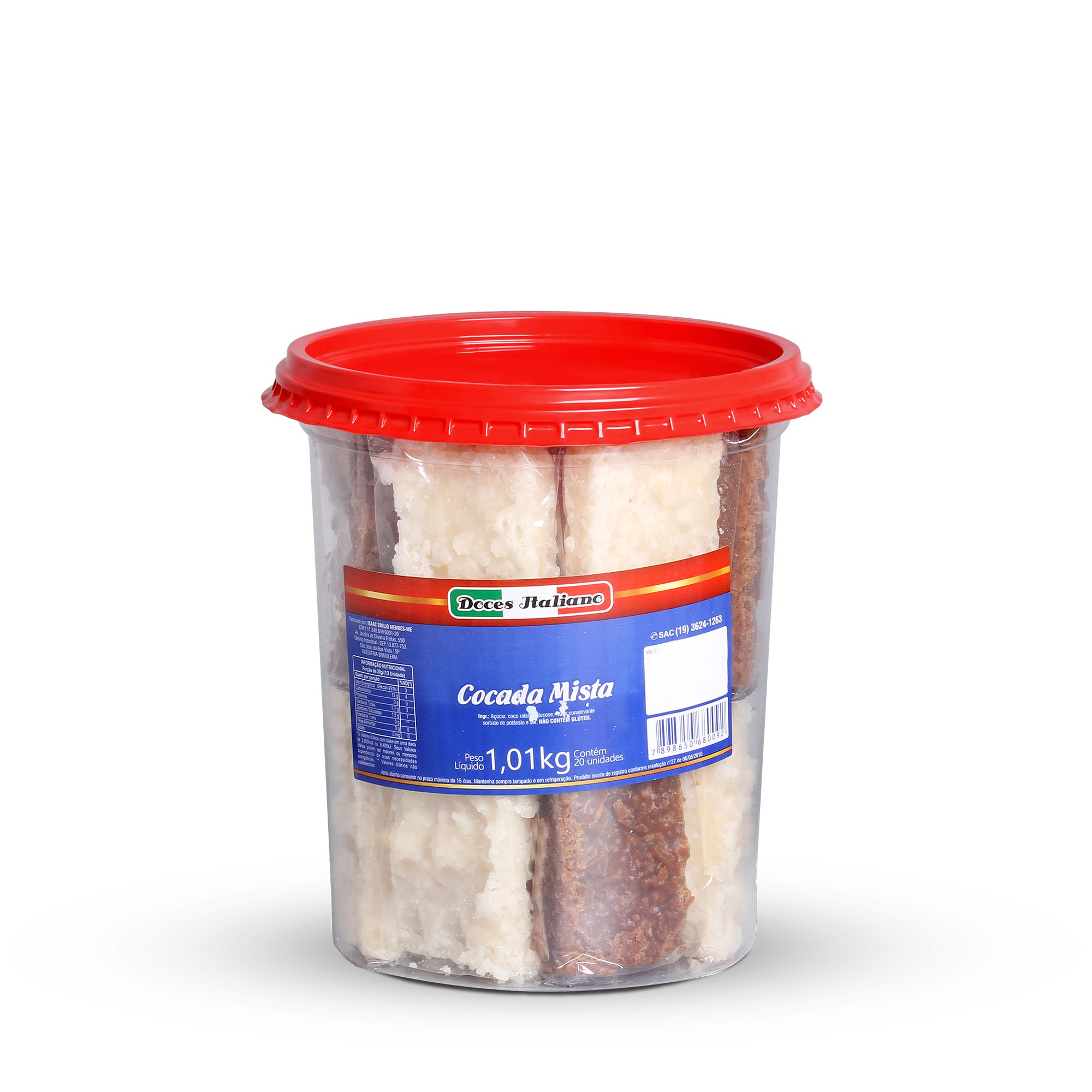 Açúcar, coco ralado, glucose, sal e coservante sorbato de potássio e sal.