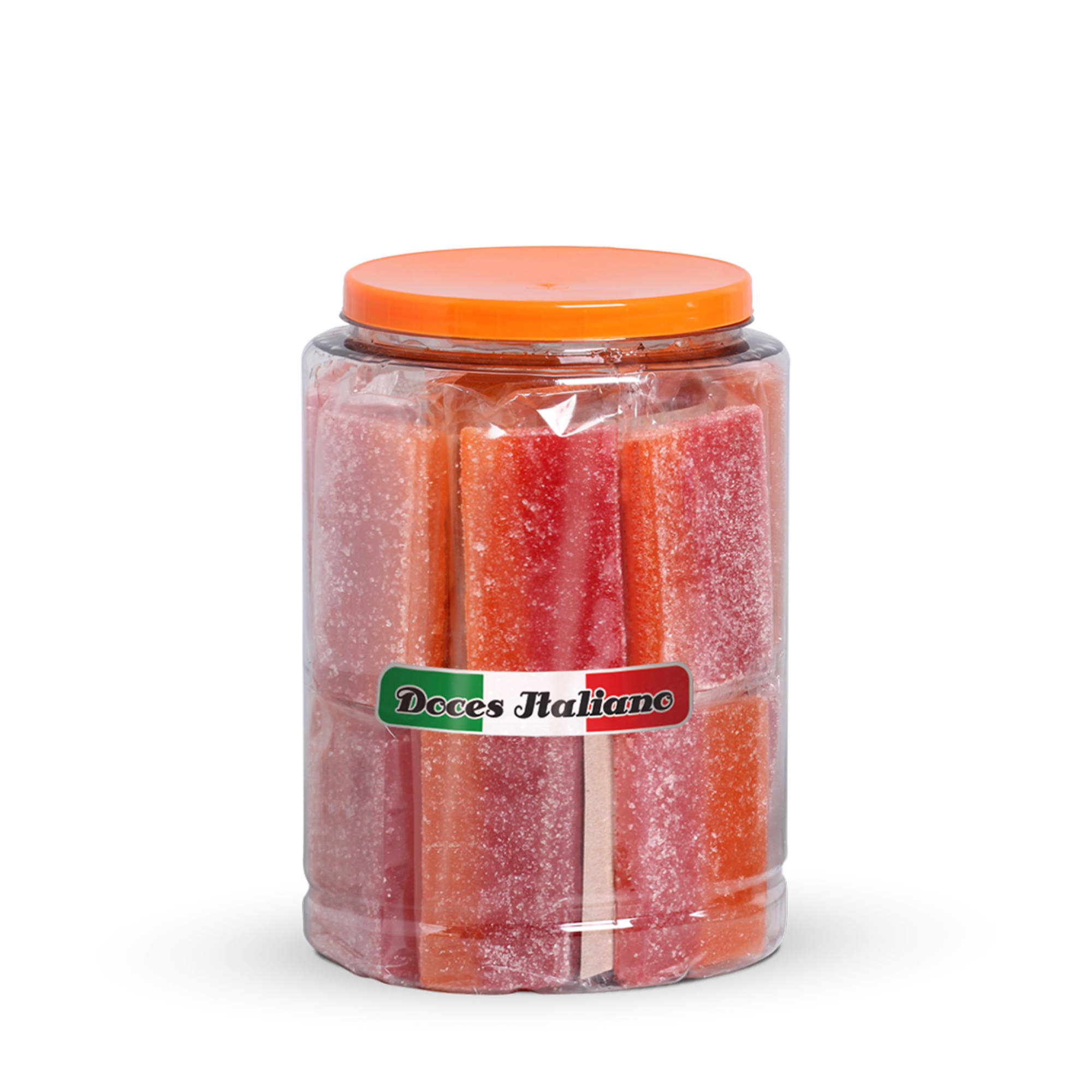 Açúcar, amido modificado, acidulante acido citrico, aroma artificial de moango e laranja, cornate vermelho bordeaux e amarelo crepusculo.